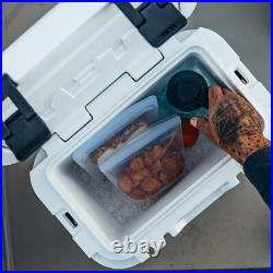 Handles move out of the way when not in use. Quick latch offers simple 1-handed access. Interlock lid system creates a form-fitting barrier against extreme temperatures. Drain plug is leakproof and offers convenient draining.
